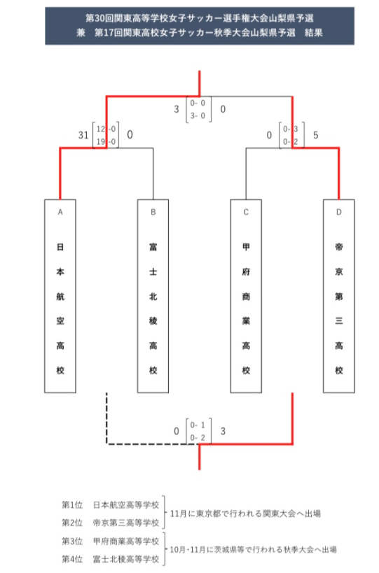優勝・準優勝の日本航空高校、帝京第三高校は全日本女子高校選手権 関東大会へ、第3位・4位の甲府商業高校、富士北稜高校は関東秋季大会へ出場となります。