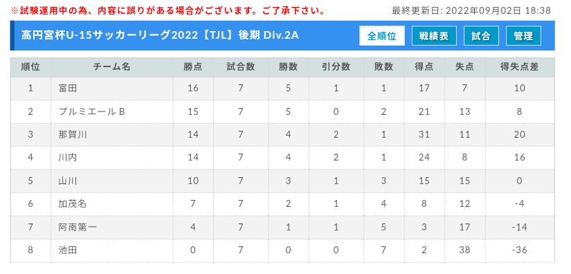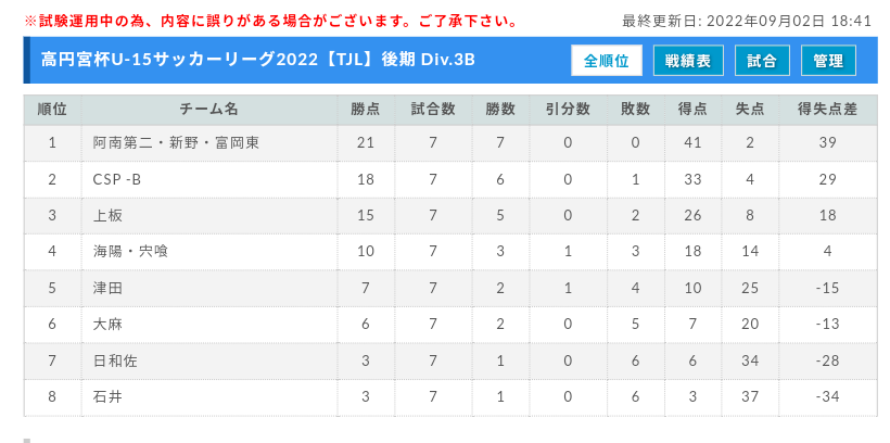 那賀川はDiv.1へ昇格、阿南はDiv.2へ降格