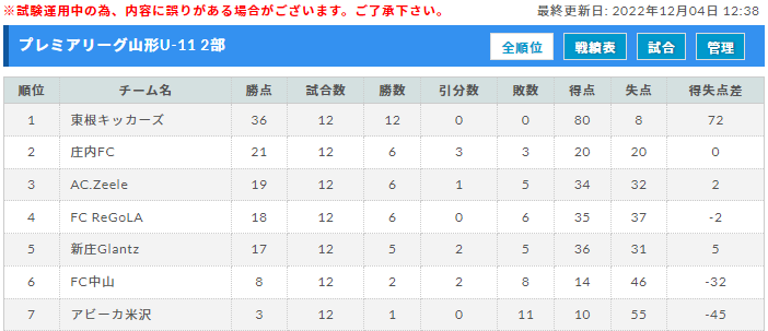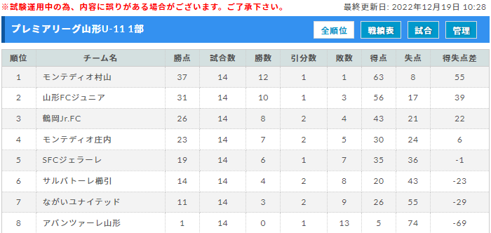 1部 12/18大会終了 1位:モンテディオ村山 2位:山形FCジュニア 3位:鶴岡Jr.FC