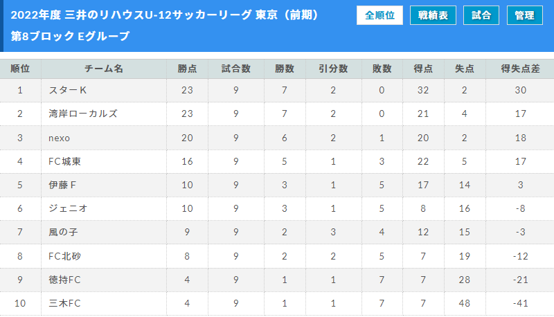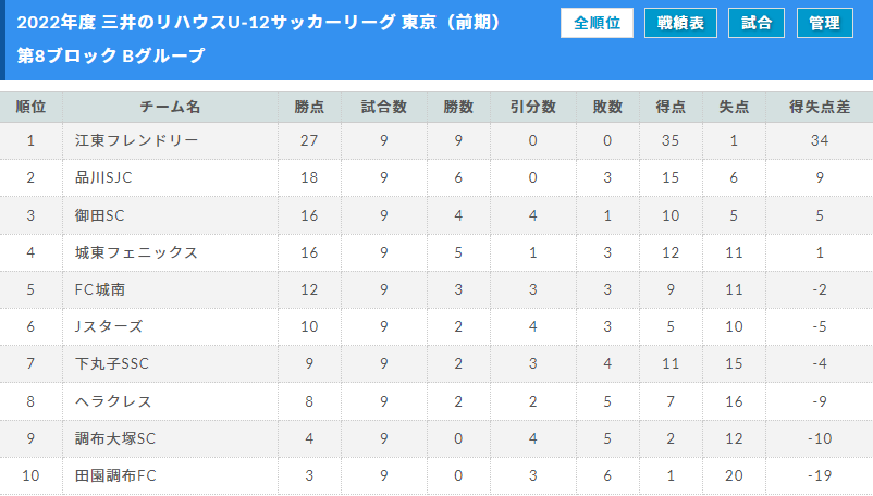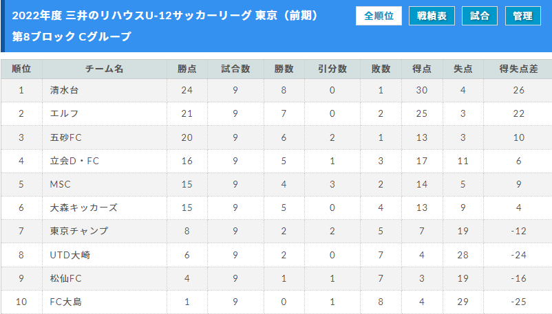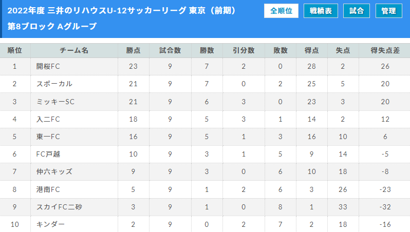 2022年度 三井のリハウスU-12サッカーリーグ東京 第8ブロック(前期)