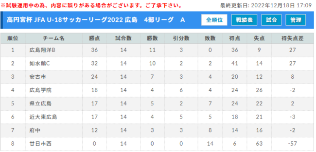 高円宮杯 JFA U-18サッカーリーグ2022 広島 3部リーグ A 全試合終了