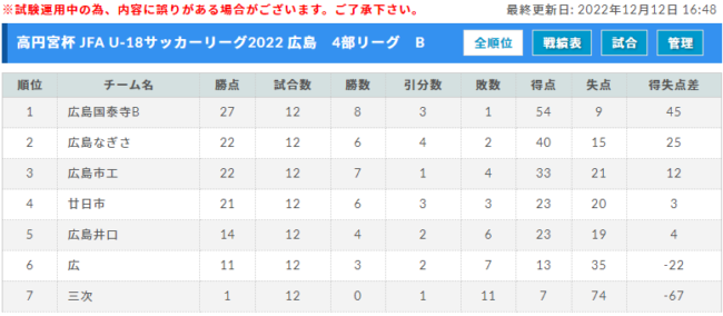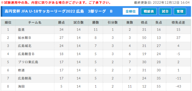 高円宮杯 JFA U-18サッカーリーグ2022 広島 3部リーグ B 全試合終了