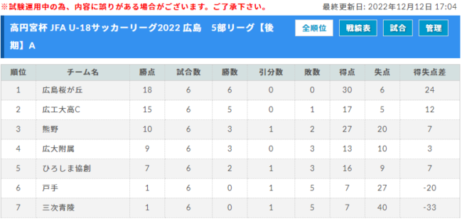 高円宮杯 JFA U-18サッカーリーグ2022 広島 5部リーグ【後期】A 全試合終了