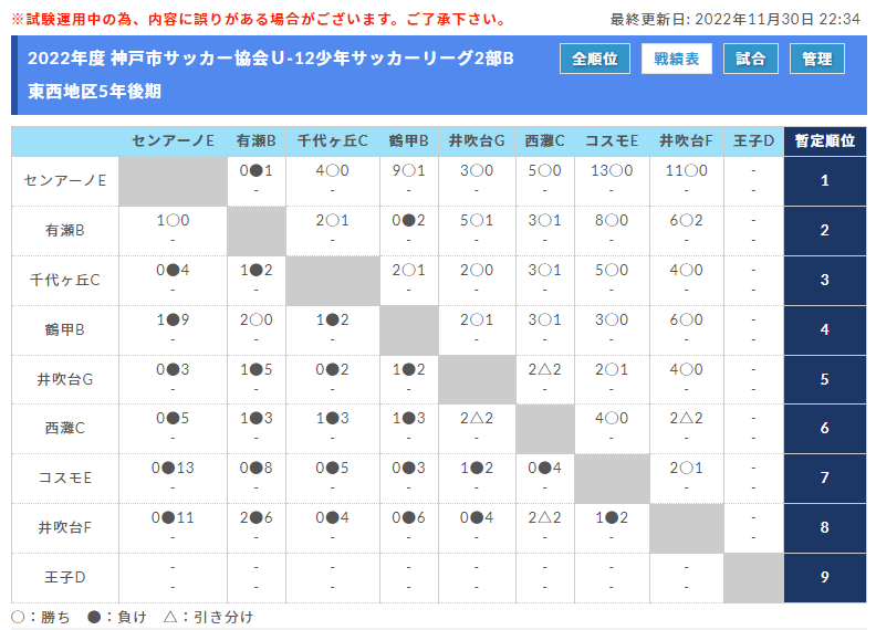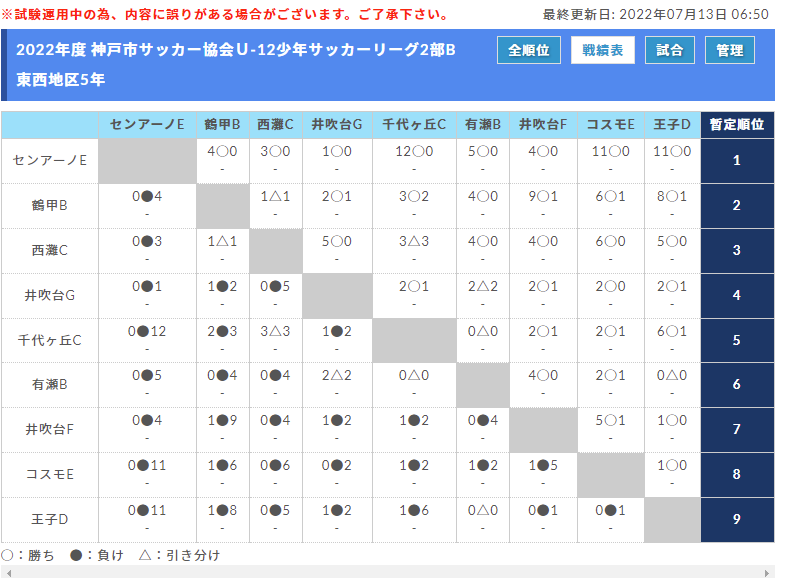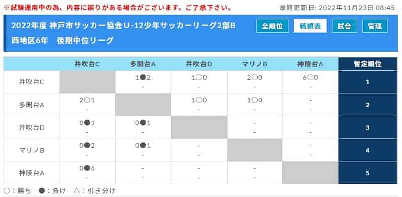 4月10日から行われている2022年度 神戸市サッカー協会U-12少年サッカーリーグ2部Bの情報をお知らせします。