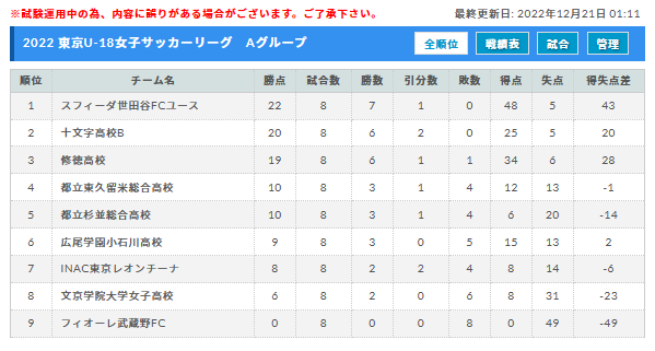 2022年度 東京U-18女子サッカーリーグ Aグループ優勝スフィーダ世田谷FCユース!Bグループ優勝都立飛鳥高校!