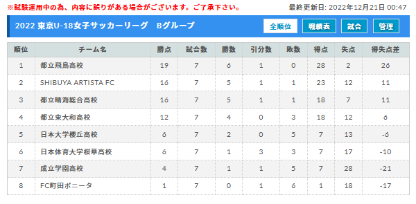 都立飛鳥高校日本大学櫻丘高校FC町田ボニータ都立晴海総合高校成立学園高校SHIBUYA ARTISTA FC日本体育大学桜華高校都立東大和高校