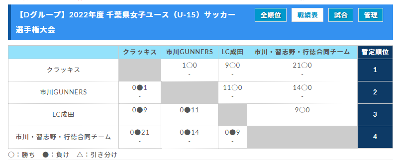 結果を試合会場から入力できる、リーグ戦績表を作成しました。他の会場の結果もわかります。
