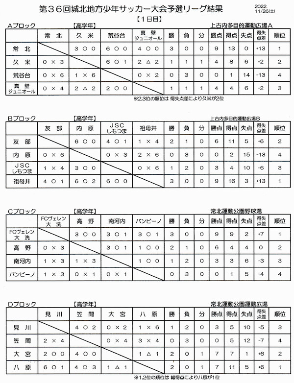 ・11/26,27 城北地方少年サッカー大会【一部結果】