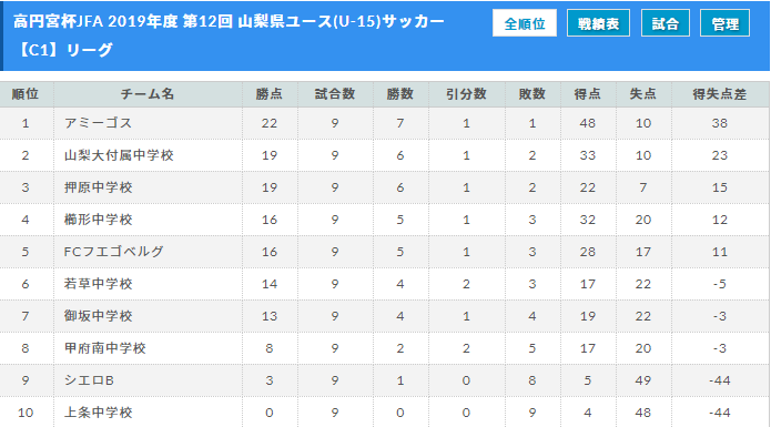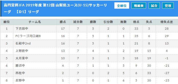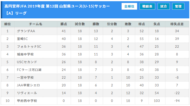 高円宮杯JFA 2019年度 第12回 山梨県ユース(U-15)サッカーリーグの試合結果を、リーグ戦表に反映させましたので、ご覧ください。いつも入力ありがとうございます。引き続き、結果入力にご協力ください。