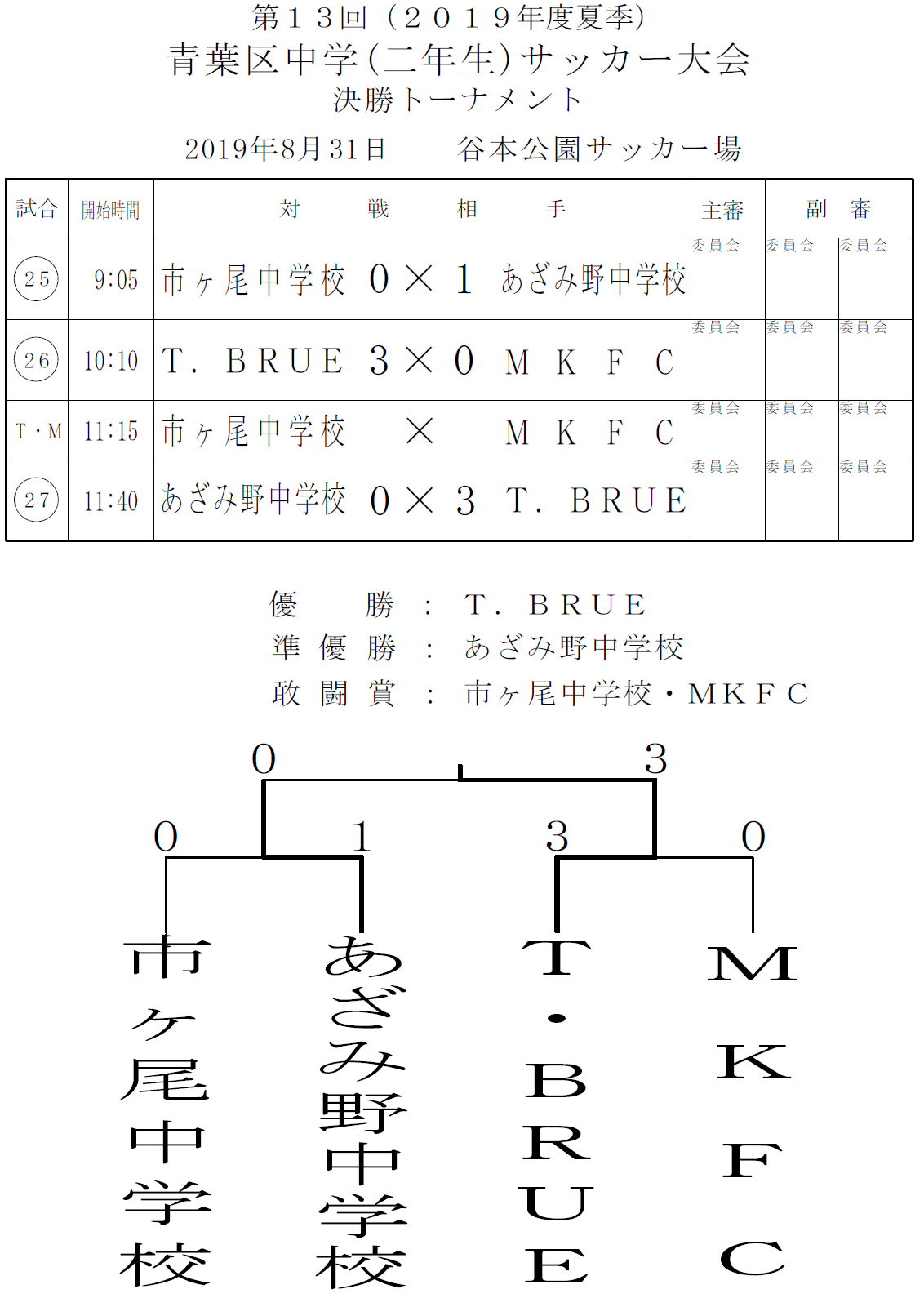 2019年度 青葉区中学生2年生夏季サッカー大会の結果が分かりましたので、お知らせいたします。