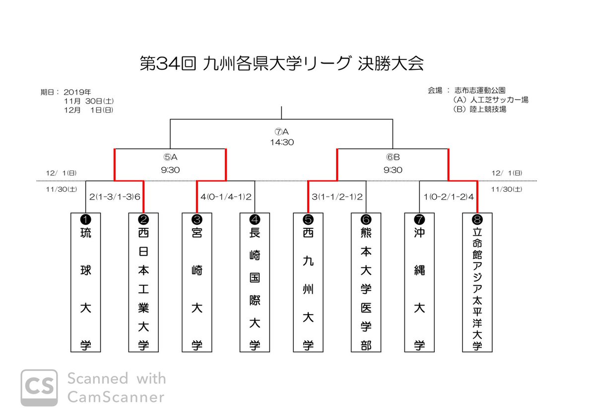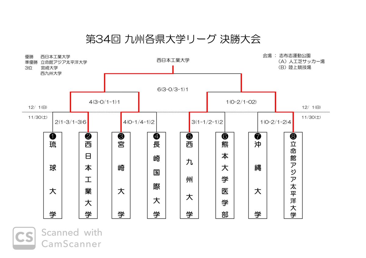 この結果、西日本工業大学が来年度九州リーグ2部リーグへの自動昇格が決まりました。また、立命館アジア太平洋大学が12月15日(日)に行われる入替戦で九州大学と対戦いたします。