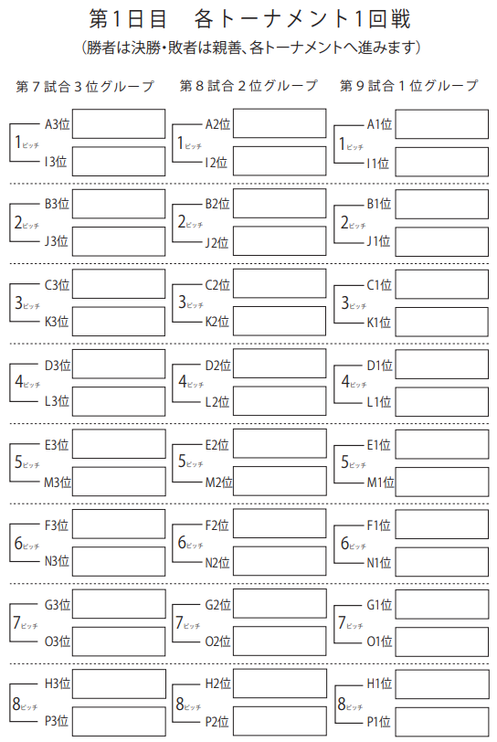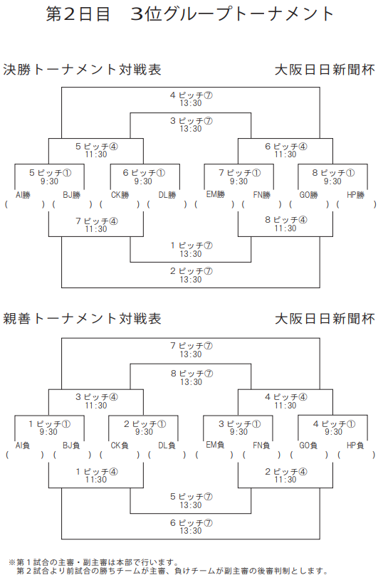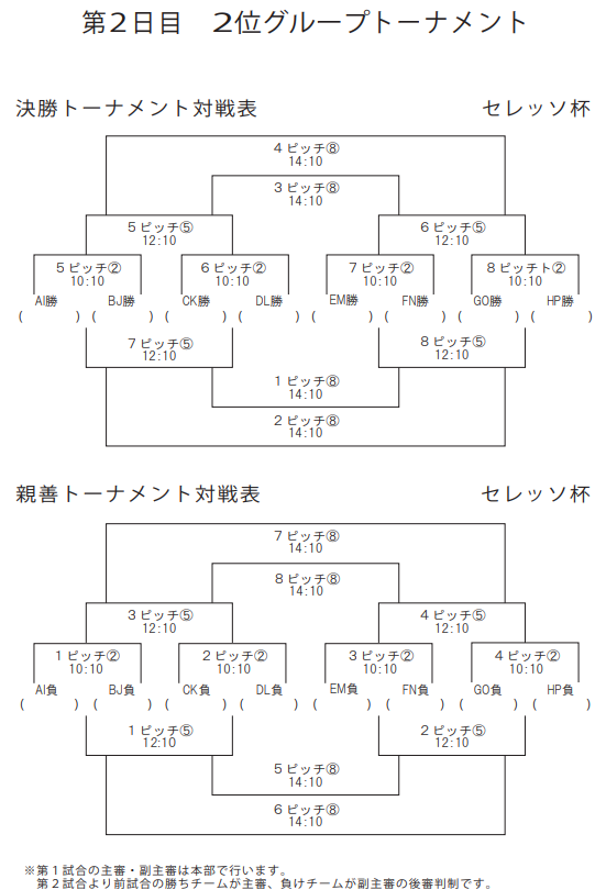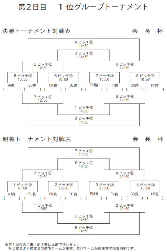 ・第2日目…順位トーナメントの決勝・親善の各トーナメント1回戦より決勝まで行うと同時に優勝も決定する。
