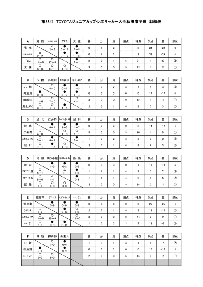 グループ2位:日新、勝平、スポルティフB、御所野、旭北、秋田泉、飯島